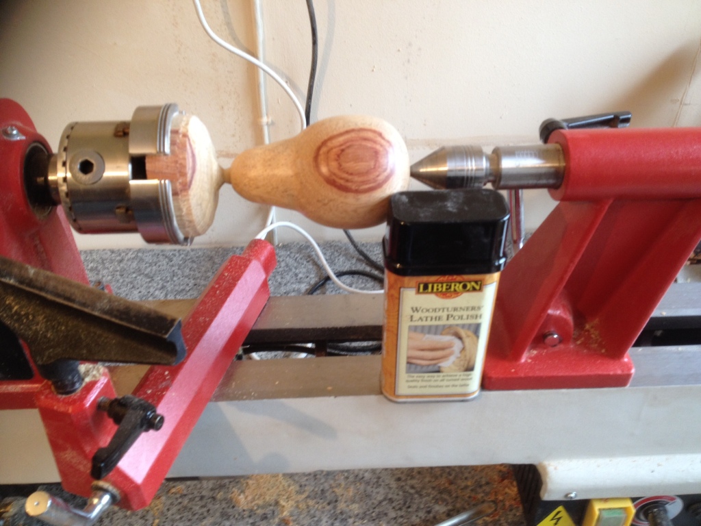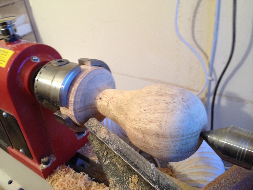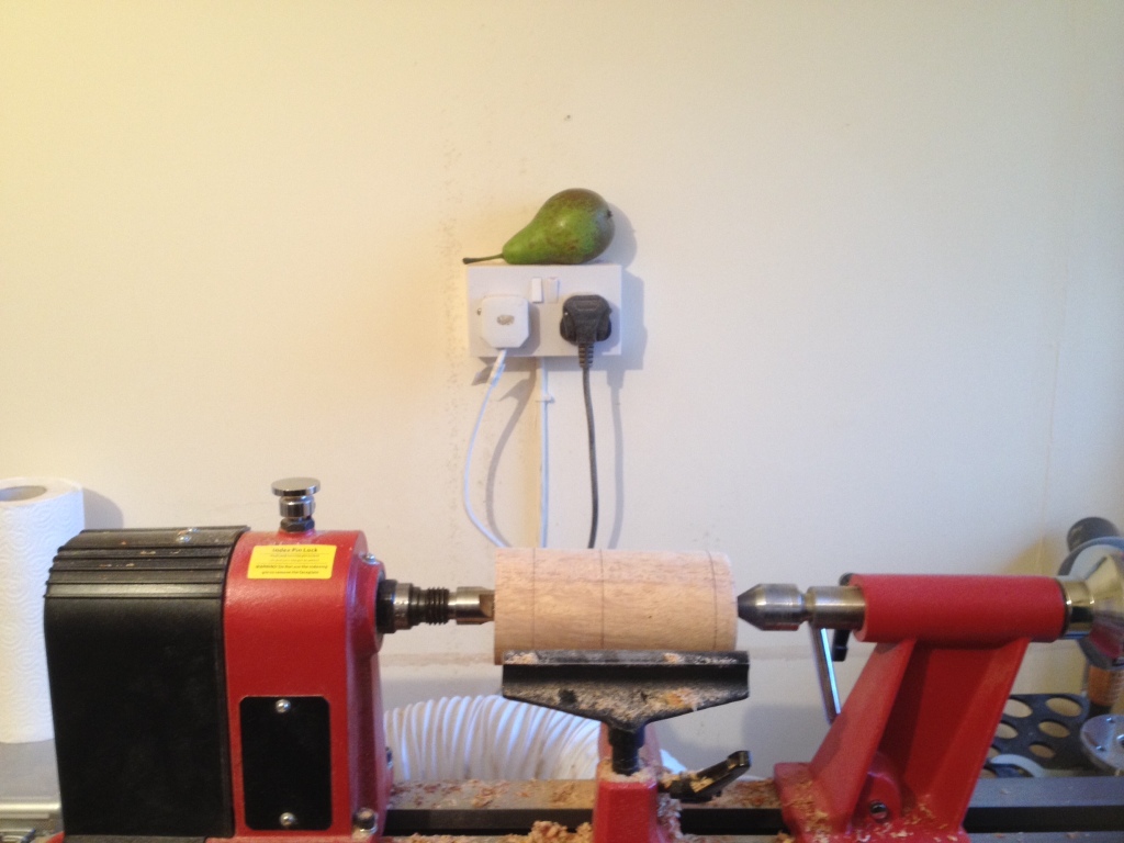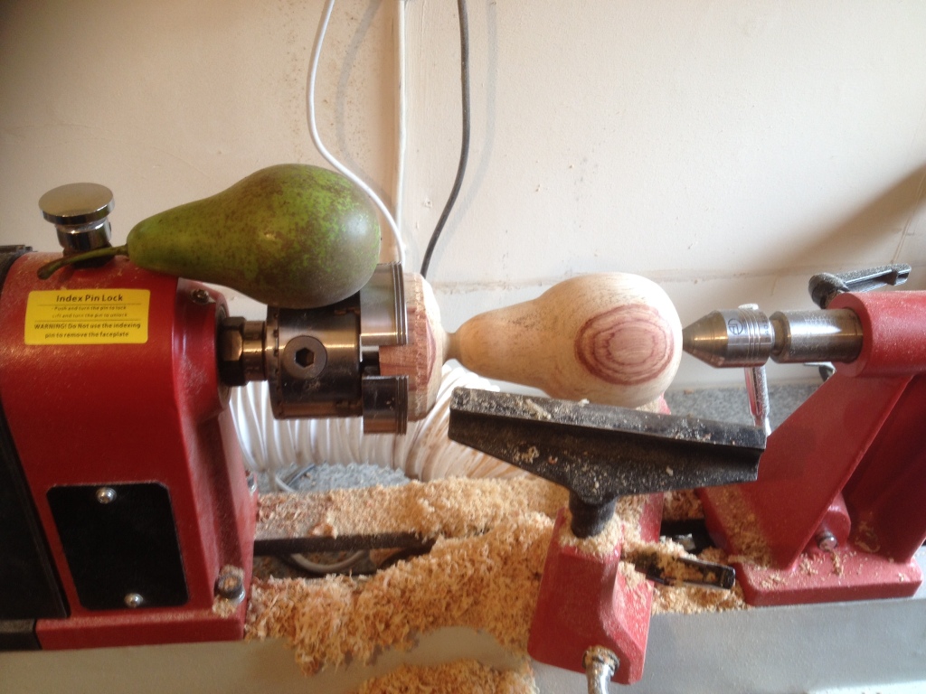 Armed with my real pear I set about shaping my blank to resemble natures own shape. I started by putting the turned blank into my lathe chuck ( I feel much happier with it secured in a chuck) and once centred I started turning the thickest end first.