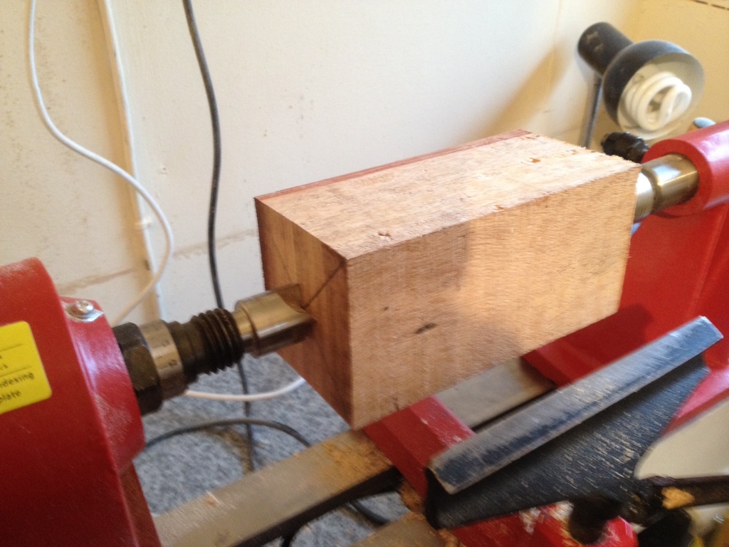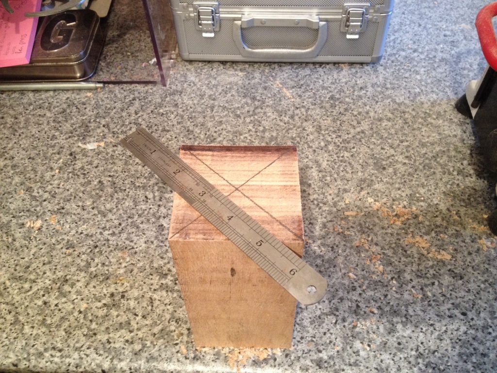 Next I had to find the centre of the wood which is easily done by marking a line across from each corner then the wood is centred between the lathe and tail stock.