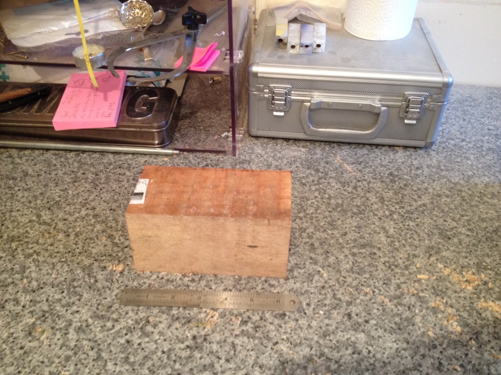 Onto the project. I cut a length of 3×3 inch square Bubinga 6 inches long.